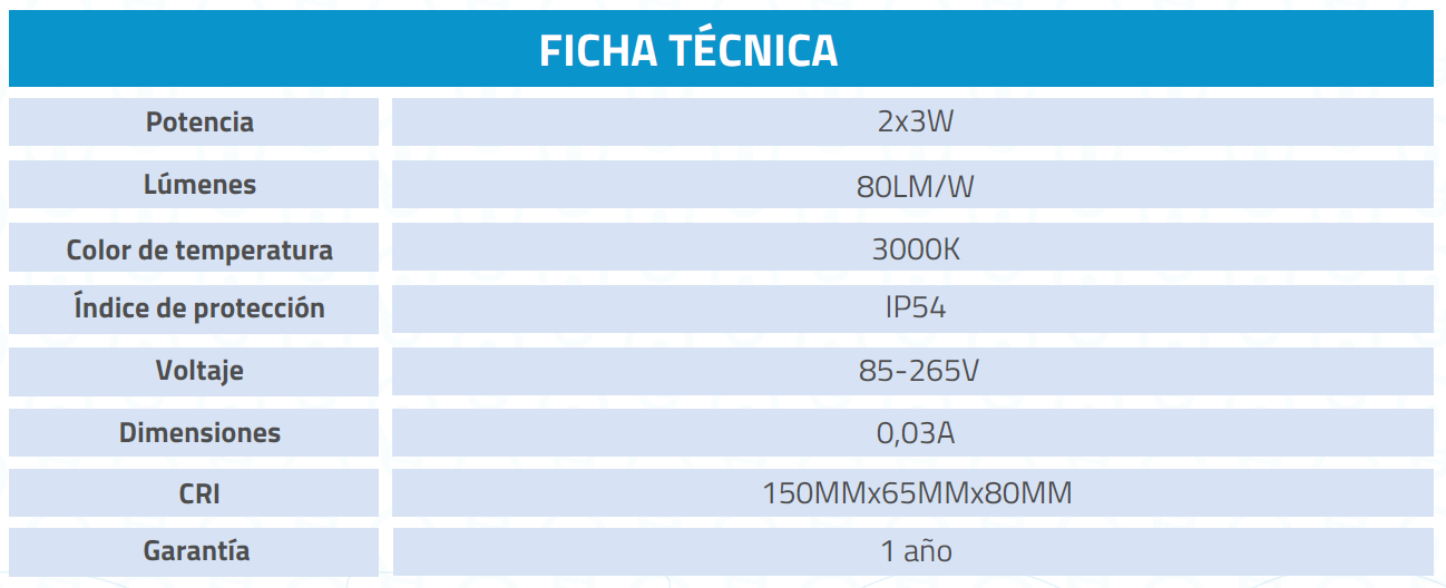 El aplique bidireccional 2x3W es una elegante y funcional luminaria de pared diseñada para proporcionar una iluminación suave y decorativa en espacios interiores. Con su diseño contemporáneo y su capacidad para emitir luz en dos direcciones, este aplique es ideal para crear ambientes acogedores y sofisticados en salones, dormitorios, pasillos y otros espacios.