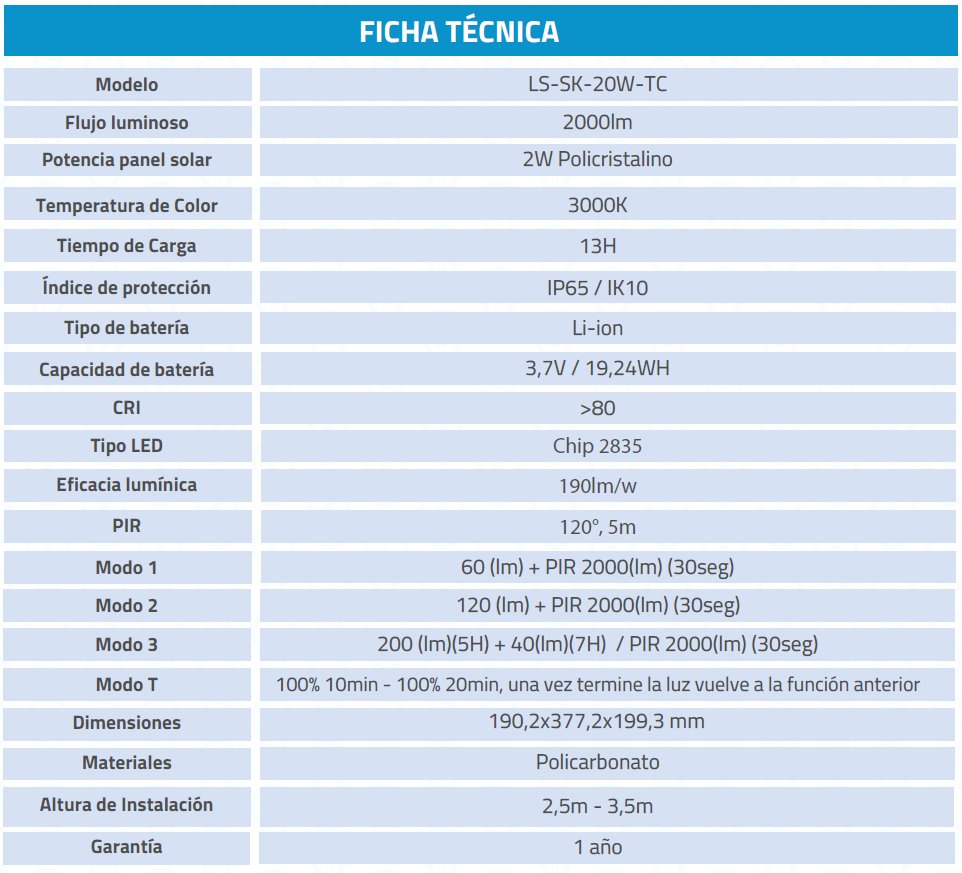 Luminaria solar con luz neutra, especialmente diseñada para la decoración e iluminación de terrazas, pasillos exteriores, entradas de hogar, etc. Cuenta con un control remoto que permite seleccionar los modos de iluminación y sensor de movimiento VER FICHA TÉCNICA