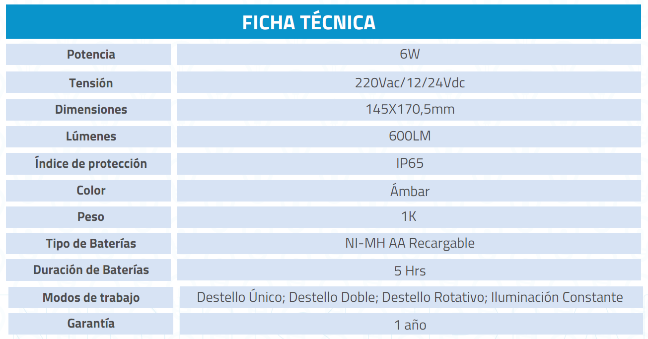 Baliza de señalización ámbar, diseñada para alertar en situaciones de emergencia. Compatible con tensiones de 220 VAC y 12/24 VDC, y equipada con un sistema de baterías recargables para uso inalámbrico.