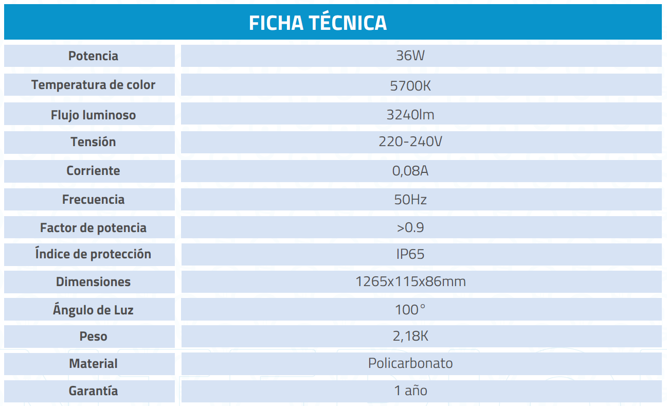 Equipo estanco de policarbonato de alta calidad y resistencia, con clips de acero inoxidable que aseguran una sujeción firme, segura y hermética. Electrificado en ambos extremos para conectar dos tubos LED de 18W, ofreciendo una luminosidad de excelente calidad. Diseñado para reemplazar canaletas de tubos fluorescentes de 2x36W, reduce el consumo eléctrico en un 50% manteniendo la misma capacidad de iluminación. Adecuado para uso interno y externo, resistente al polvo, humedad y agua directa. Para instalaciones exteriores, se recomienda utilizar cajas estancas para proteger las conexiones eléctricas.