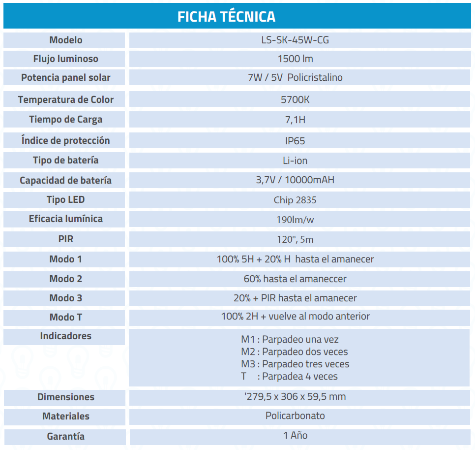 Luminaria solar tipo proyector de área, equipada con un panel fotovoltaico de 7W que permite una carga completa en 7 horas. Ofrece 4 modos de funcionamiento y la capacidad de ajustar el ángulo de enfoque entre 60°, 90°, y 120° mediante un selector circular en la parte posterior de la óptica, lo que proporciona gran versatilidad.
