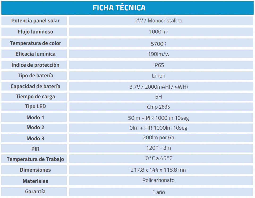 La luminaria solar tipo proyector ofrece 3 modos de control para ajustar la luminosidad y optimizar el uso del sensor PIR. Incluye un indicador luminoso que muestra el nivel de carga de la batería: verde para más del 70%, naranja para entre 30% y 70%, y rojo para menos del 30%.