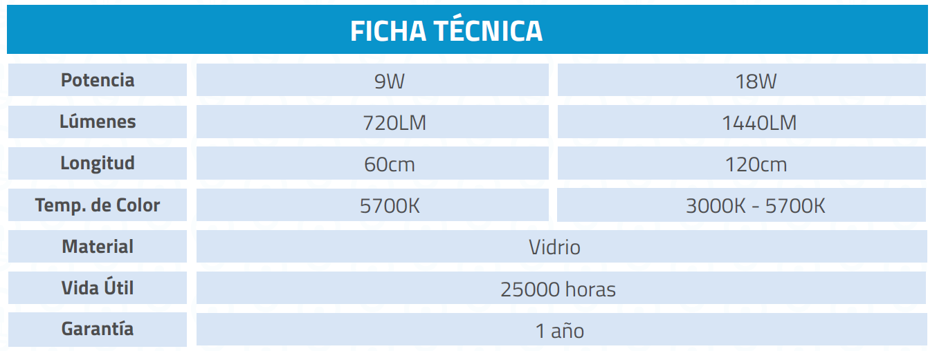 Estos tubos están diseñados para reemplazar a los tubos fluorescentes tradicionales en aplicaciones de iluminación comercial, industrial y residencial. Alta eficiencia energética, larga vida útil, y capacidad para proporcionar una iluminación brillante y uniforme. Están disponibles en una variedad de tamaños y configuraciones para adaptarse a diferentes necesidades de iluminación. Disponibles en 60cms y 120cms.